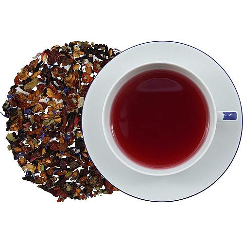 Natürlich aromatisierte ostfriesische Mischung mit Erdbeer-Grapefruit-Zitrone-Geschmack und Sanddornbeeren, Sanddornbeeren geschnitten, Orangenschalen, Orangenblättern und Orangenblüten