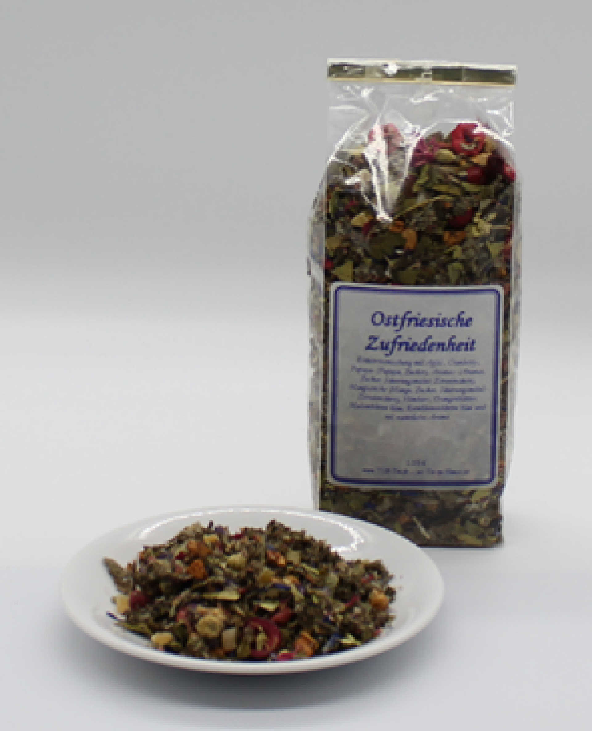 Kräuterteemischung mit Apfel-, Cranberry-, Papaya- (Papaya, Zucker), Ananas- (Ananas, Zucker, Säuerungsmittel: Zitronensäure), Mangostücke (Mango, Zucker, Säuerungsmittel: Zitronensäure), Himbeer-, Orangenblätter, Malvenblüten blau, Kornblumenblüten blau und rot, natürliches Aroma