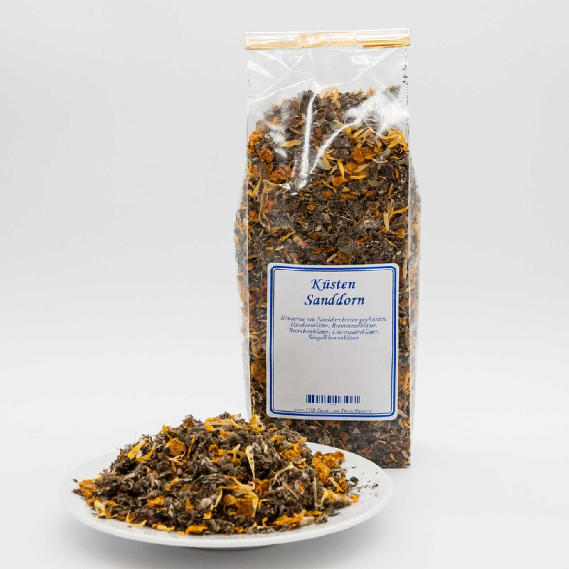 Kräutertee mit Sanddornbeeren geschnitten, Himbeerblätter, Brennnesselblätter, Brombeerblätter, Löwenzahnblätter, Ringelblumenblüten