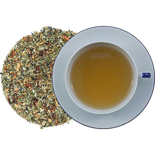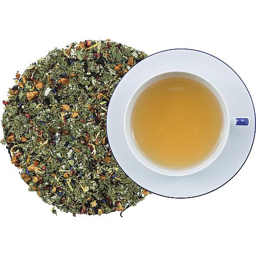Kräutertee mit Brennnesselblättern, Apfelstücken, Orangenecken, Lemongras, Erdbeerblättern, Rote Johannisbeeren, Granatapfelblüten, Verbeneblättern und Kornblumenblüten