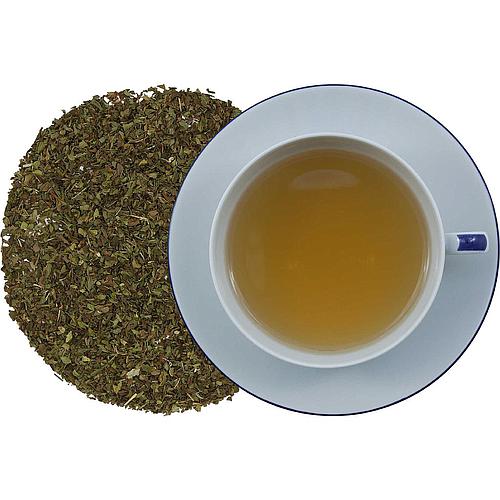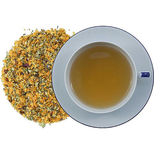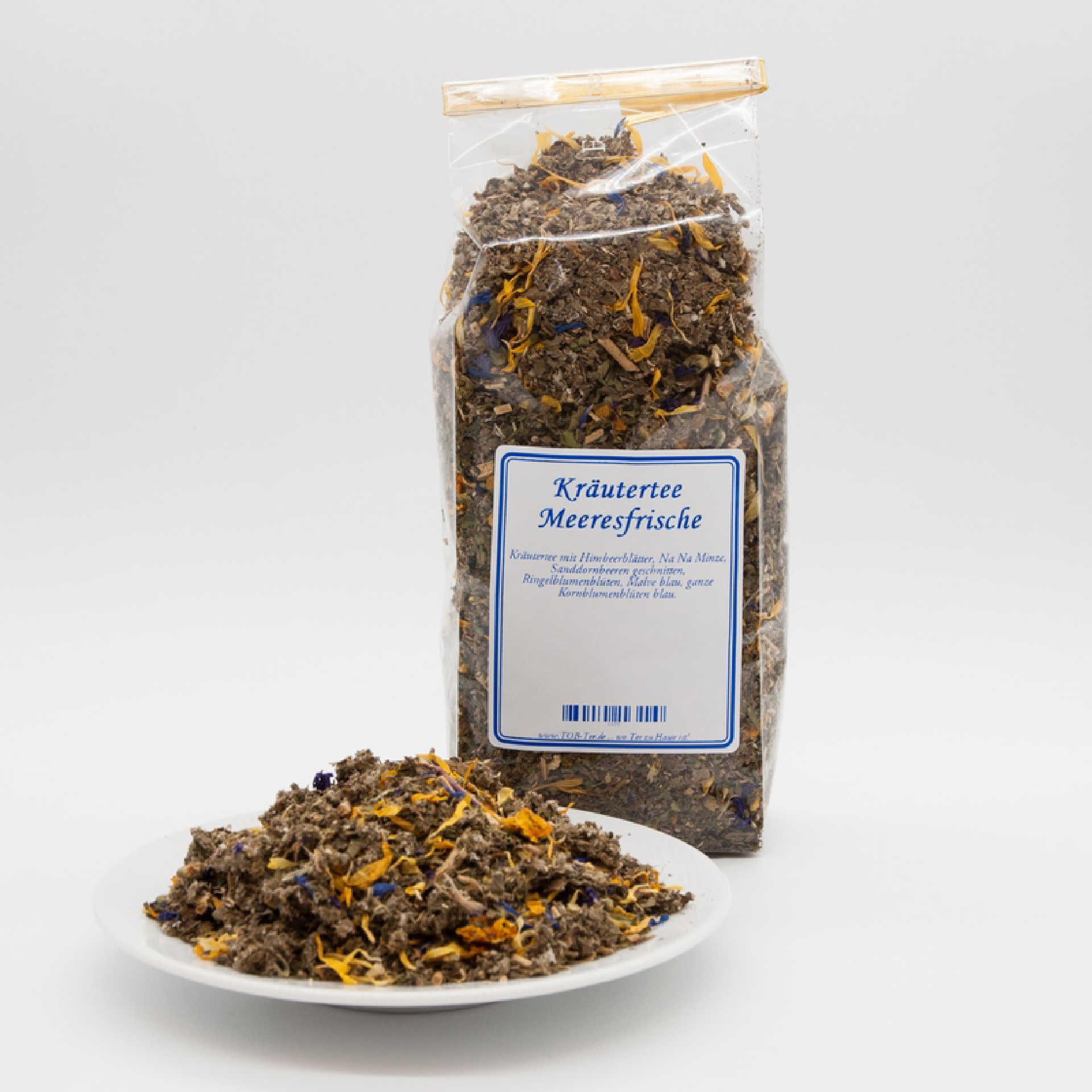 Kräutertee mit Himbeerblätter, Na Na Minze, Sanddornbeeren geschnitten, Ringelblumenblüten, Malve blau, ganze Kornblumenblüten blau.
