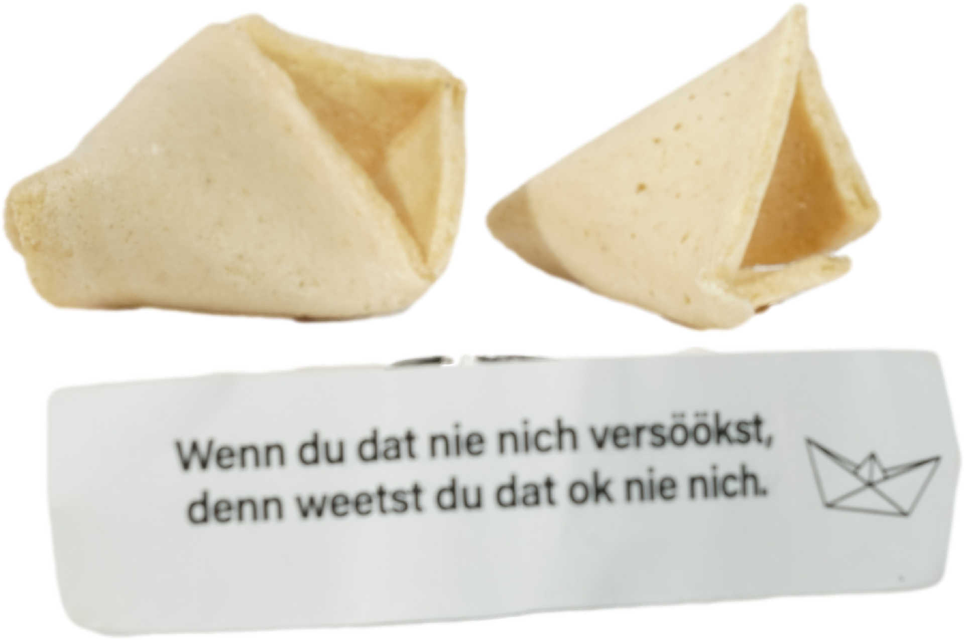 Diese Glückskekse in zwei typisch regionalen Geschmacksrichtungen „Rullerke“ (Neujahrskuchengebäck mit Anis und Kardamom) und BIO Sanddorn sind mit über 200 Lebensweisheiten auf Plattdeutsch mit hochdeutscher Übersetzung befüllt. Die plattdeutsche Schreibweise orientiert sich dabei an dem überregionalen SASS Wörterbuch, um in allen plattdeutschen Regionen verstanden zu werden.