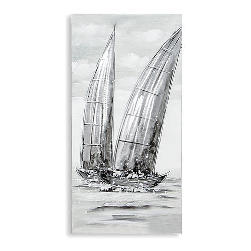 Bild "Regatta" Leinwand weiß/grau/silberfarben mit Aluminium-Applikationen, ein Boot
