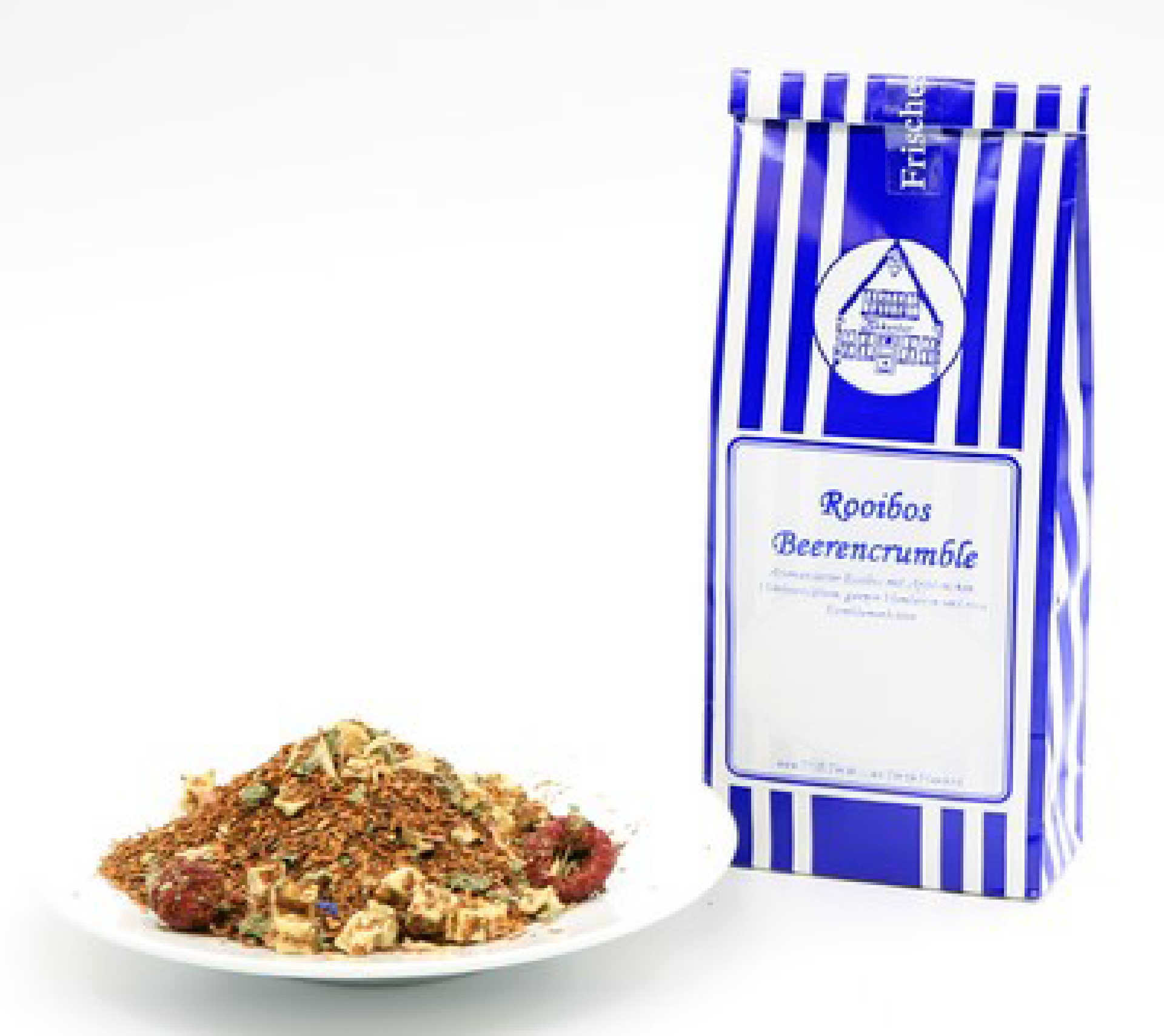 Aromatisierter Rooibos mit Apfelstücken, Himbeerblättern, ganzen Himbeeren und rosa Kornblumenblüten