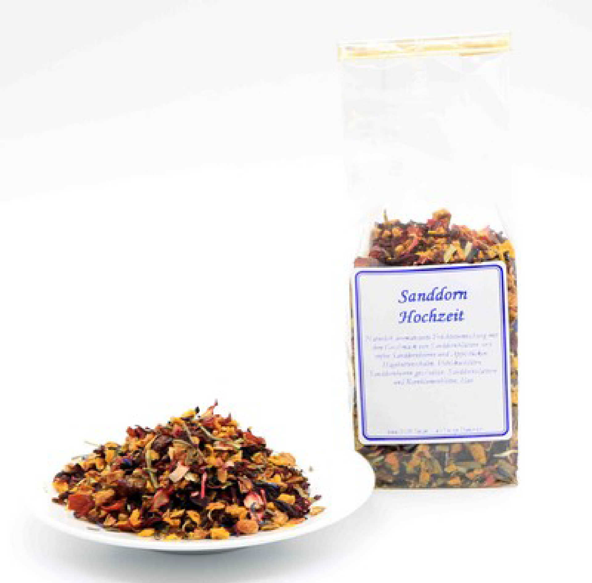 Natürlich aromatisierte Früchteteemischung (Hibiscus, Hagebutte und Apfel) mit dem Geschmack von Sanddornblättern und reifen Sanddornbeeren und Apfelstücken, Hagebuttenschalen, Hibiskusblüten, Sanddornbeeren geschnitten, Sanddornblättern und Kornblumenblüten, blau