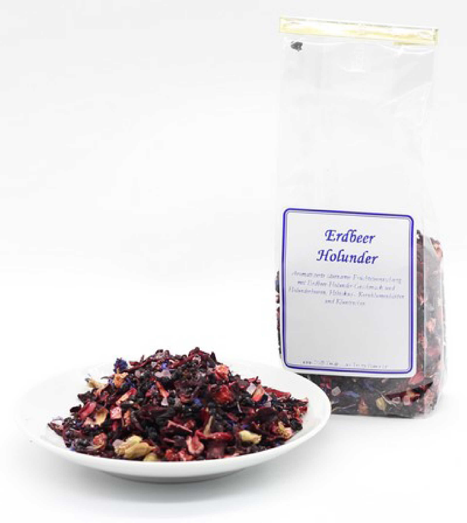 Aromatisierte säurearme Früchteteemischung mit Erdbeer-Holunder-Geschmack und Holunderbeeren, Hibiskus-, Kornblumenblüten und Kluntinchen
