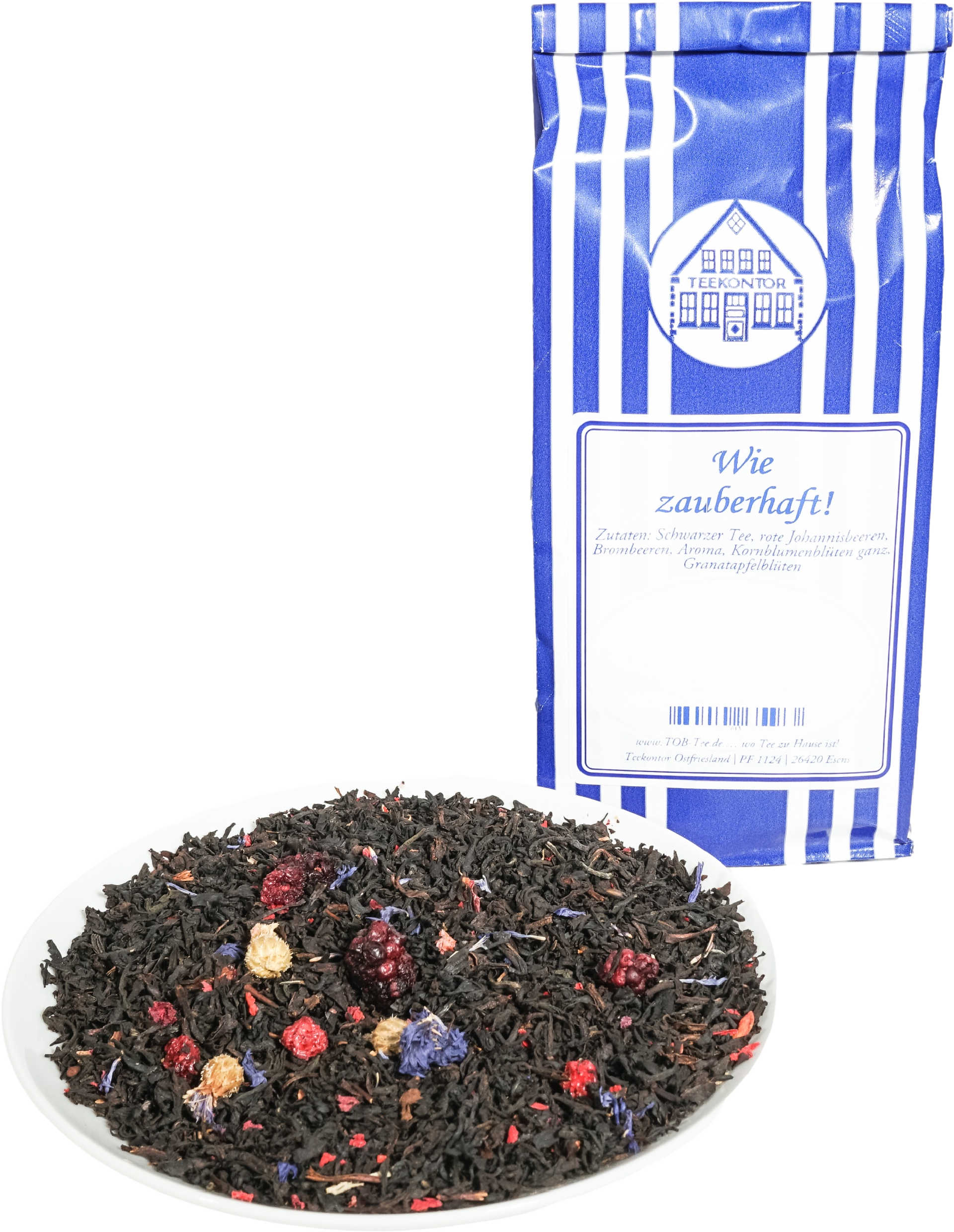 Zutaten: Schwarzer Tee, rote Johannisbeeren, Brombeeren, Aroma, Kornblumenblüten ganz, Granatapfelblüten