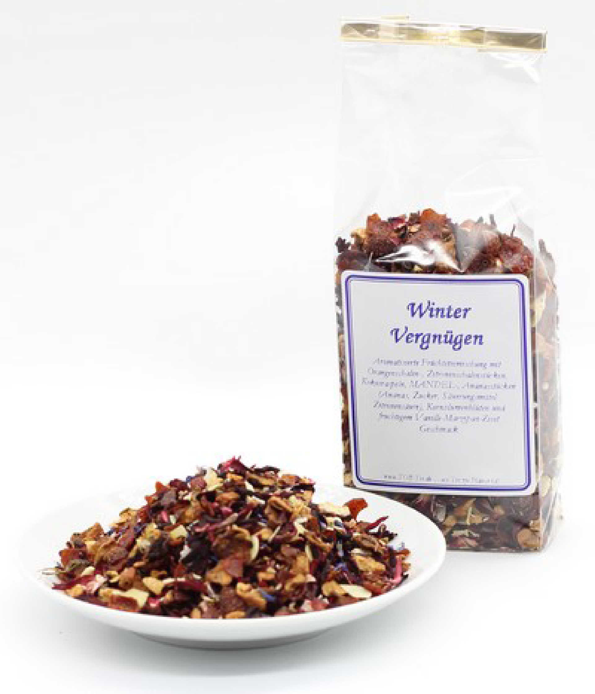Aromatisierte Früchteteemischung (Hibiscus, Hagebutte und Apfel) mit Orangenschalen-, Zitronenschalenstücken, Kokosraspeln, MANDEL-, Ananasstücken (Ananas, Zucker, Säuerungsmittel: Zitronensäure), Kornblumenblüten und fruchtigem Vanille-Marzipan-Zimt Geschmack