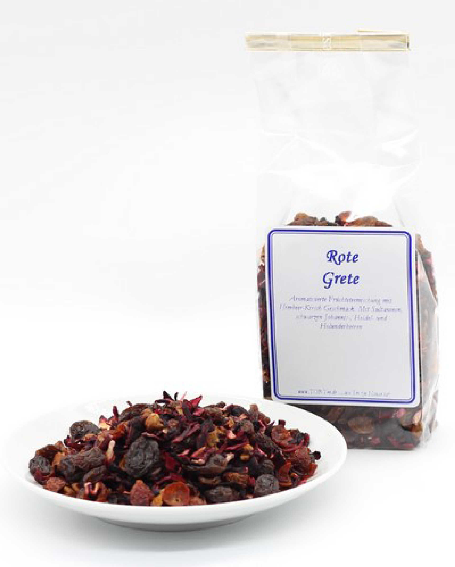Aromatisierte Früchteteemischung (Hibiscus, Hagebutte und Apfel) mit Himbeer-Kirsch Geschmack. Mit Sultaninen, schwarzen Johannis-, Heidel- und Holunderbeeren