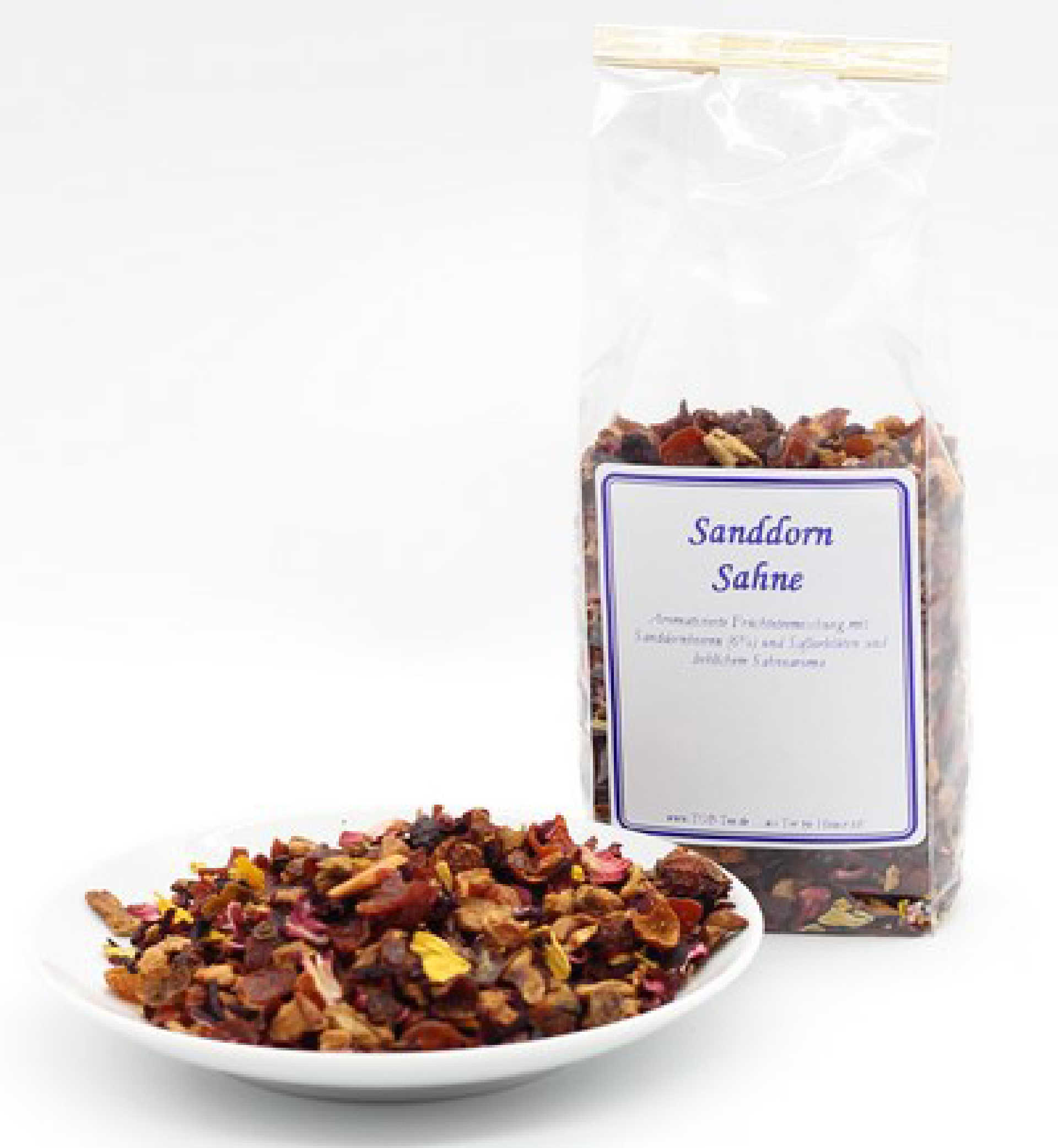 Aromatisierte Früchteteemischung (Hibiscus, Hagebutte und Apfel) mit Sanddornbeeren und Saflorblüten und lieblichem Sahnearoma