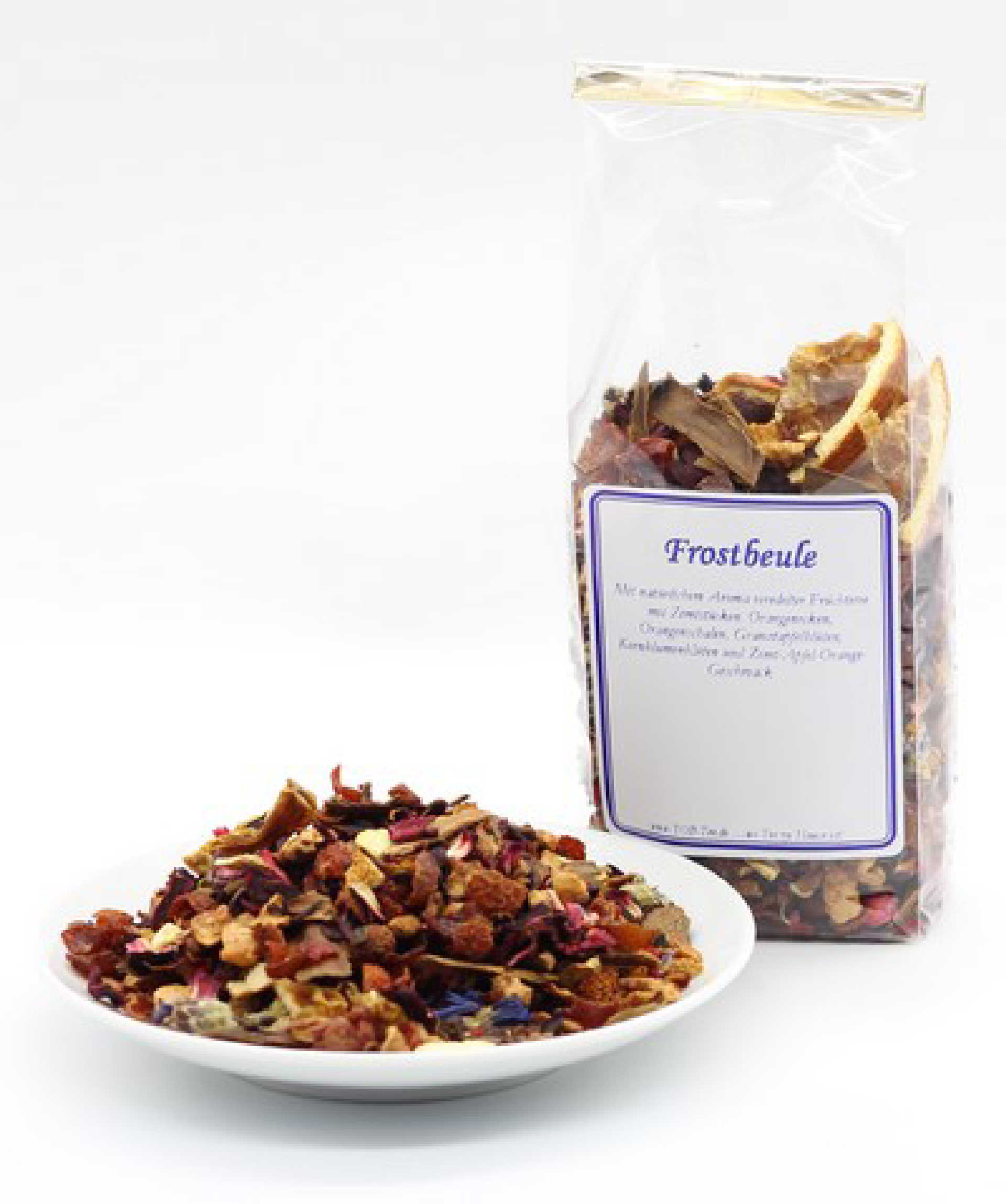 Mit natürlichem Aroma veredelte Früchteteemischung (Hibiscus, Hagebutte und Apfel) mit Zimtstücken, Orangenecken, Orangenschalen, Granatapfelblüten, Kornblumenblüten und Zimt-Apfel-Orange-Geschmack