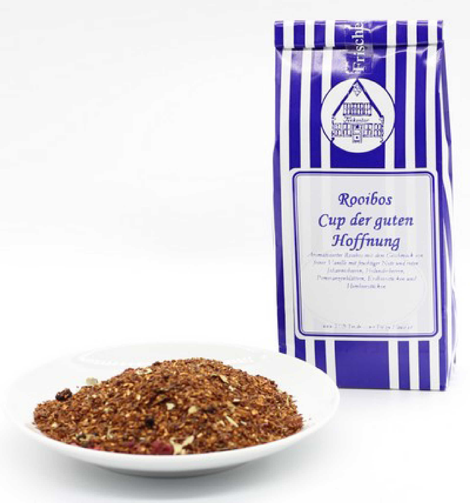 Aromatisierter Rooibos mit dem Geschmack von feiner Vanille mit fruchtiger Note und roten Johannisbeeren, Holunderbeeren, Erdbeerblättern, Erdbeerstücken und Himbeerstücken
