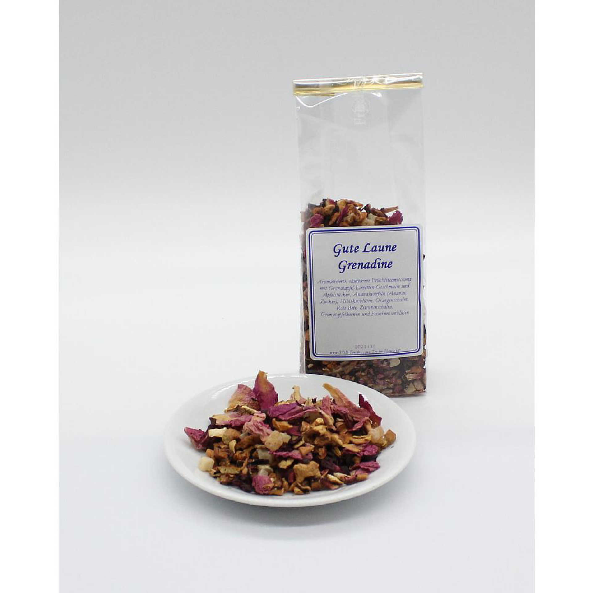 Aromatisierte, säurearme Früchteteemischung mit Granatapfel-Limetten-Geschmack und Apfelstücken, Ananaswürfeln (Ananas, Zucker), Hibiskusblüten, Orangenschalen, Rote Bete, Zitronenschalen, Granatapfelkernen und Bauernrosenblüten