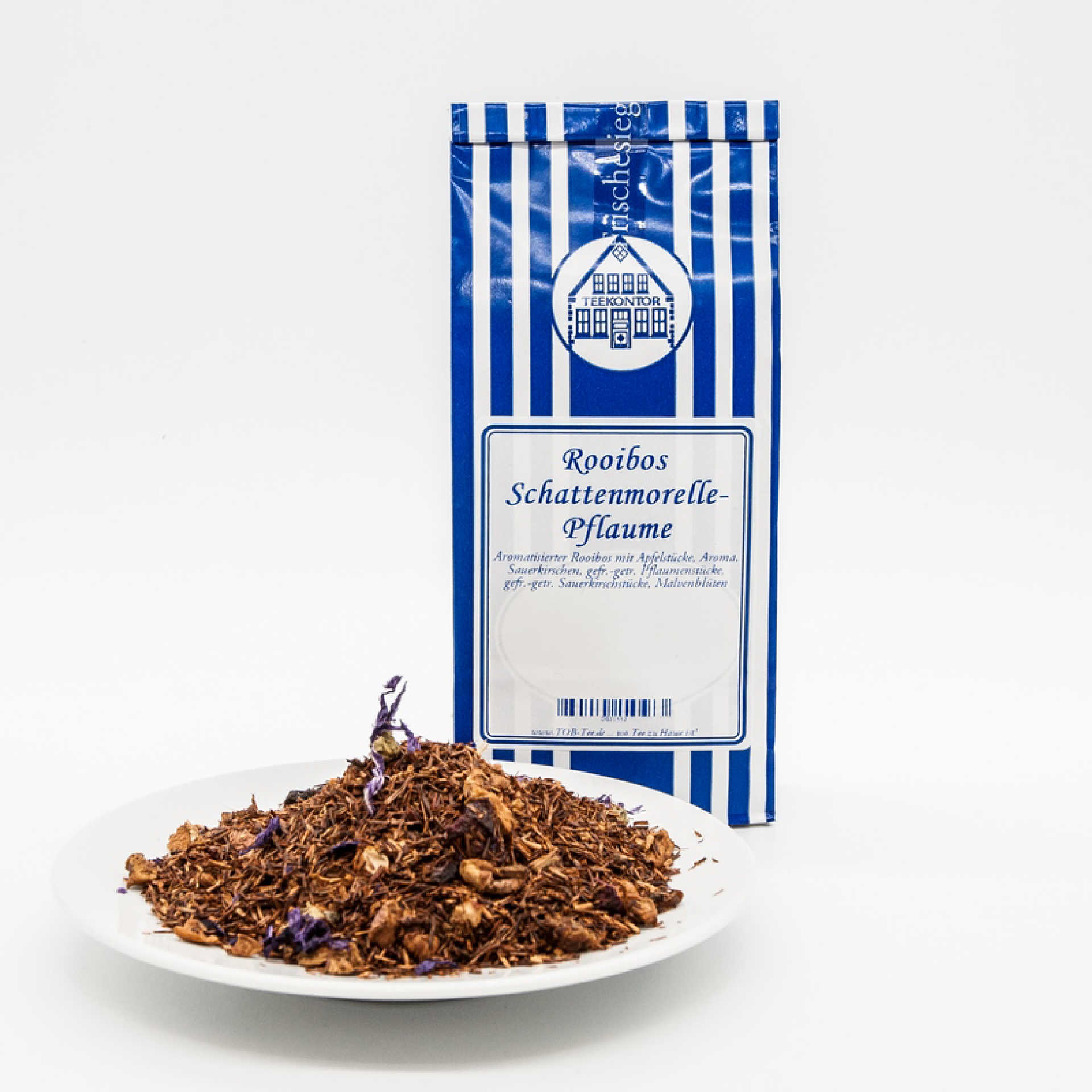Aromatisierter Rooibos mit Apfelstücke, Aroma, Sauerkirschen, gefr.-getr. Pflaumenstücke, Sauerkirschstücke, Malvenblüten.