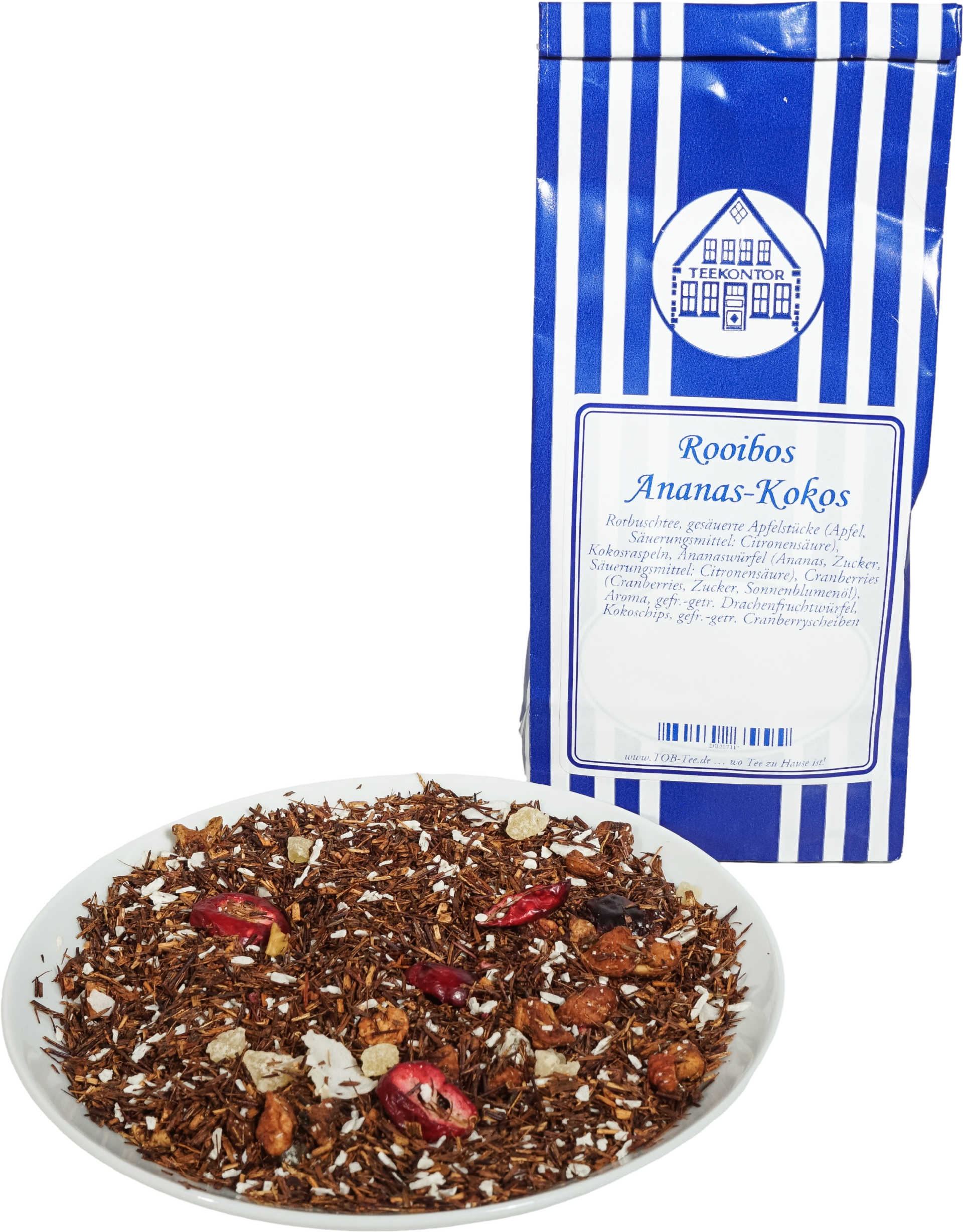 Rotbuschtee, gesäuerte Apfelstücke (Apfel, Säuerungsmittel: Citronensäure), Kokosraspeln, Ananaswürfel (Ananas, Zucker, Säuerungsmittel: Citronensäure), Cranberries (Cranberries, Zucker, Sonnenblumenöl), Aroma, gefr.-getr. Drachenfruchtwürfel, Kokoschips, gefr.-getr. Cranberryscheiben